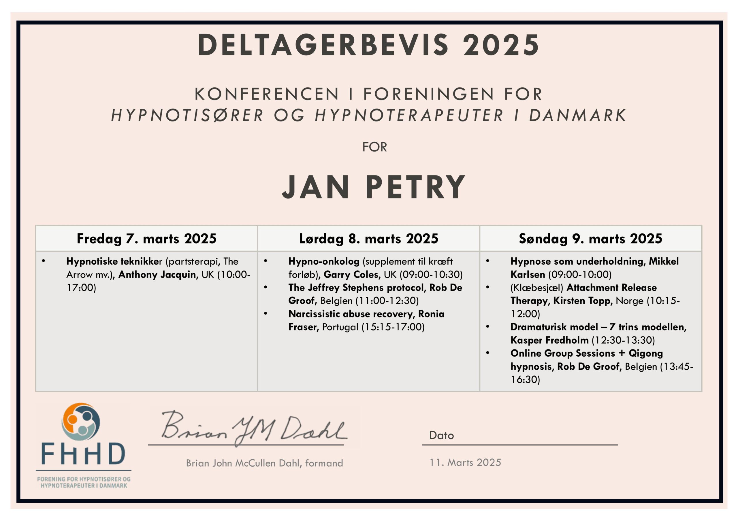 – Member of the Association of Hypnotists and Hypnotherapists in Denmark (FHHD).