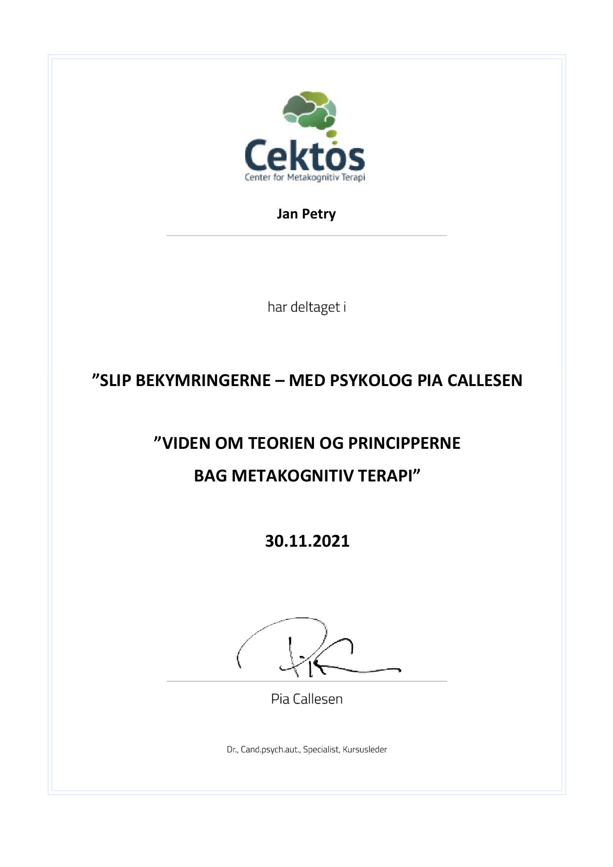 – Since the early 1990s, has undergone personal therapy/group therapy and, in addition to his formal training, participated in numerous intensive retreats focused on various therapeutic themes/personal therapy.
